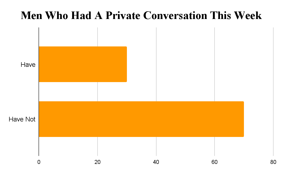 Many men keep their feelings of loneliness to themselves rather than expressing them. According to the American Perspectives Survey, only 30% of men reported having a private conversation with a friend in the past week where they shared their personal feelings.